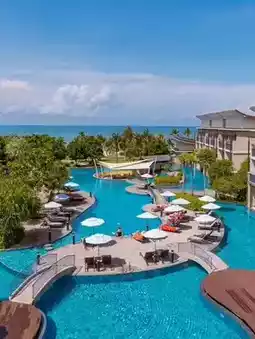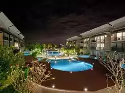 The swimming pool here is very large. It is not far from the beach. During the day, it is a beautiful blue that matches the blue sea. At night, it is beautifully lit.