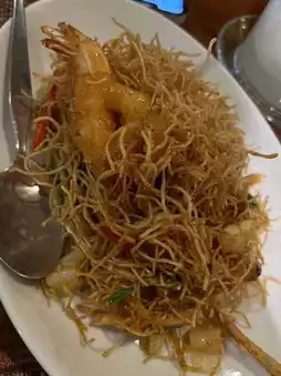 The third dish, Khun Saka ordered fried food to complete the flavors. That dish was crispy noodles with crispy shrimp. (I’ll gossip a bit… My Khun Saka is very meticulous when it comes to eating. No matter what food she orders, she always has one boiled dish and one fried dish. She said that the texture of the food must be complete. It must be soft and crispy so that when you put it in your mouth and chew it, it will be just right. The taste is the same. Spicy must cut the sweetness. Salty must cut the blandness. She is very meticulous. She shouldn’t be a lawyer. 😅) Back to our dish. I don’t usually like to eat sweet savory food, but I still think it’s delicious. These crispy noodles have a sour smell but not too much or too strong. They are very refreshing. They are really crispy. They are freshly fried. They are very delicious. I eat them with Dwee’s shrimp chili paste.