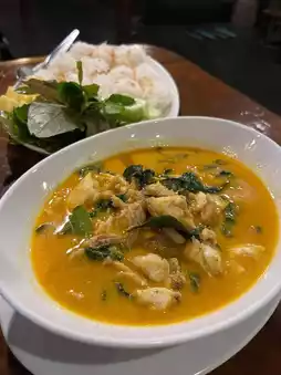 The last dish… Crab curry with boiled rice noodles… our highlight. When they were served, wow! A huge plate! Oh my! It's all gone!! 555 It tastes very good, not too spicy, and goes well with noodles. It goes well together…it goes well together. There are chunks of crab meat. 🤤
