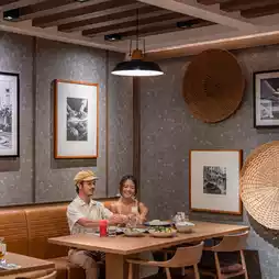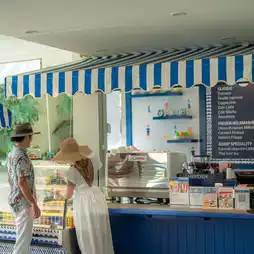 seafood, and The Pizzeria, an Italian-style restaurant. The pizza is very delicious. In addition, there is also a small cafe called Le Scoop. There are ice cream, tea, coffee, and snacks.
