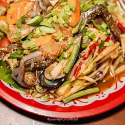 Doi Talay ✨🌶️ Northern-Isan food restaurant, spicy in Khao Lak area. On this trip to Khao Lak, Phi Jeans found a very delicious and spicy restaurant. 😋 The shop is located in Soi Bang Niang. Drive almost to the end of the alley, there is a parking lot. The atmosphere of the shop is very inviting. Those who like to sit and relax can choose to sit on the floor or on cushions for a different feel. Or you can sit at an air-conditioned table. Let's start with northern food. • Doi Talay Khantok, very full, comes with Nam Phrik Num, Nam Phrik Ong, along with Sai Ua, Moo Yor, Naem, and Pork Rinds for dipping. • Khao Soi Moo Thot, this is Phi Jeans' favorite menu. Comes with complete side dishes. • Laab Kua Jao, this dish is also delicious. It has a slight scent of makhwaen. • Turmeric Chicken, the chicken meat is very tender, followed by the spiciness of Isan food. • Tam Platter Seafood, oh my, I have to say that the fermented fish is very delicious. And it comes in a very big plate. You have to dip sticky rice in the fermented fish sauce with it, it's so spicy. • Pork and fermented fish set Dipping it with fermented fish sauce is really delicious. Grilled beef with jaew sauce is also excellent. Anyone who comes to the Khao Lak area and wants to eat fusion food from the North and Northeast, I recommend that you stop by here. ⏰: 11:00 a.m. - 10:00 p.m. Closed every Thursday —————————#Doitalay #Doitalay #khaolak #Phang Nga restaurant review #journeycallsofficial #Get a discount without relying on luck