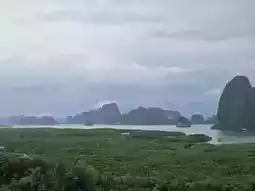 A panoramic view of Phang Nga Bay’s limestone cliffs rising from the sea