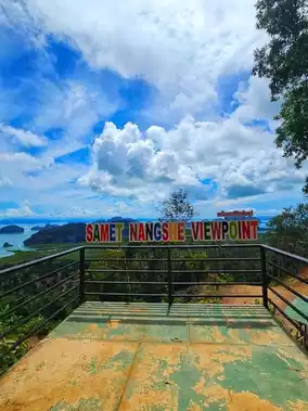 Take a photo with the "Samet Nang Chee" sign and the wooden deck: a must-visit spot.