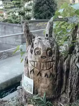 there is a Totoro wood carving? and a raccoon figurine as a landmark at the entrance.