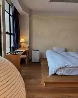The hotel has two guest rooms, each with wooden window frames and frosted glass windows, creating a unique light and shadow effect when sunlight enters the room. The rooms are equipped with comfortable beds and modern facilities, providing guests with a cozy stay.