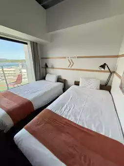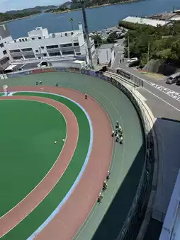 I stayed for three nights to coincide with the Summer Night Festival GⅡ Night Race. The hotel is located at the first corner of the Tamano Velodrome, featuring an eight-story building with a colorful exterior inspired by cycling uniforms. During race events, the 3rd to 6th floors serve as accommodations for the cyclists, while the 7th and 8th floors are guest rooms.