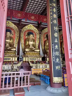 The layout that leads to the central axis is the standard structure of a traditional Tang Dynasty temple. The buildings are all decorated with red Dancheong and golden eaves,