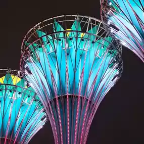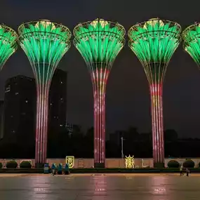 When the sun sets over Hefei, Huiyan Towers (徽盐·观澜府牌坊) come alive in full glow — a fusion of traditional Hui-style architecture and modern lighting. The twin pagoda-style towers, usually elegant by day, turn into neon lanterns of gold and crimson, reflecting beautifully on the nearby lake and walkways.