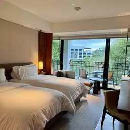 ❤️ If you want to relax alone, that's no problem either. The hotel has a swimming pool, gym, and golf practice range. The modern design of the rooms and the large floor-to-ceiling windows offer beautiful views, making you feel like you're in Bali!