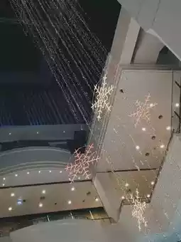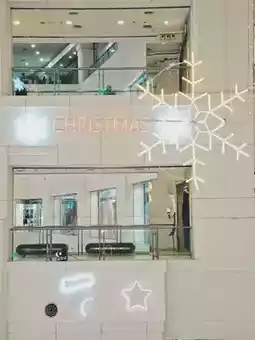 This year's Christmas event at Taimao Shopping Center features an oversized golden Christmas tree in the B2 atrium, along with a 10-meter-long golden light waterfall, creating a strong festive atmosphere. During the event, there was a 10-minute snowflake light and music show every day, accompanied by romantic lights and music. Every hour, there were soft snowflakes falling, and the children had a great time at the scene. If you look up, you can see a giant Santa Claus climbing on the railing on the 3rd floor, climbing out of the chimney with a big yellow gift bag on his back. It's a super cute scene.