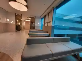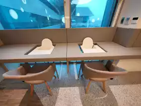 Taoyuan Airport's Terminal 2 offers a children's play area, located between the C5 and C6 lounges on the 3rd floor. This eco-friendly playground features a forest park theme, complete with a slide (unintelligibly closed on the day), a building block wall, and an interactive play wall. There are also facilities like a nursery and nursing room, seating, dining tables, and plenty of charging ports, making it convenient for parents to let their kids relax and charge their phones.