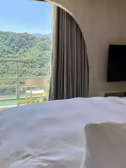 My last stay was in a brand new 16-ping executive suite. Two double beds faced two large floor-to-ceiling windows, allowing for ample natural light and allowing you to gaze directly at the mountains across the way from your bed. Opening the floor-to-ceiling windows onto the balcony offers a panoramic view of the lake. It's that luxurious feeling you get when you're in a real estate commercial with a "first-row lake view"!