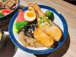 Many people order salmon donburi. Two large pieces of fish fillet are served.