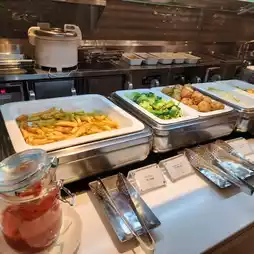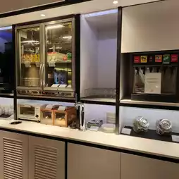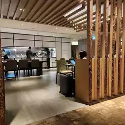 The lounge has quite a lot of seats. There are both tables and private corners. There are hot food and drinks available, such as soft drinks, coffee, or the famous milk tea. For the hot food, I chose a big round pork ball with onions and sauce inside. I recommend eating it with ketchup. It's really delicious.