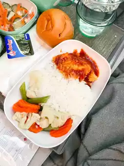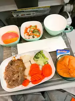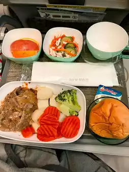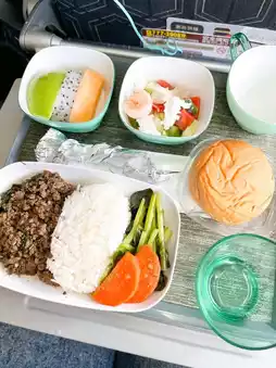 Eva Air flight food review🛫On the way there, we flew BKK-Taipei at 12:30. The menu available was stir-fried beef with basil and stir-fried chicken with ginger. We chose #stir-fried beef with basil. It was sooo delicious! It came from Thai Airways' kitchen. The beef was so fragrant. The rice was soft. However, the salad was a bit bland.😋