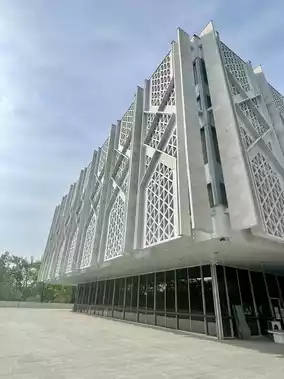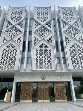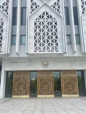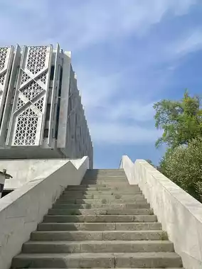 In spring, the State Museum of History of Uzbekistan in Tashkent presents a striking contrast between its modernist architecture and the surrounding seasonal bloom. The building’s cubic form, symbolizing eternity in Eastern architecture, is adorned with intricate geometric sun-protective screens known as “panzharas,” inspired by traditional Uzbek designs.  These white marble lattices stand in stark relief against the vibrant colors of blossoming trees and lush greenery that envelop the museum during this season. This juxtaposition of the building’s austere, geometric facade with the lively, organic forms of springtime flora creates a captivating visual experience, highlighting the harmonious blend of Uzbekistan’s rich cultural heritage and contemporary architectural expression.