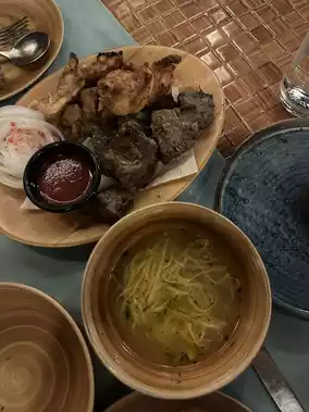Delicious Kazakh Cuisine: The menu highlights traditional dishes, with the standout being Besh Barmak—a hearty combination of meat and dough served on a large platter called "lagan." Perfect for sharing, it’s an excellent choice for group dining. Personally, I highly recommend the chicken noodle soup—it’s a must-try!