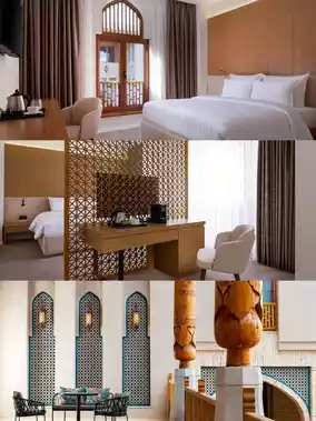 🔹Luxury hotel located in Bukhara’s old town, Middle Eastern style design blending wood and ceramics, surrounded by historical relics, deeply cultural charm