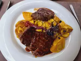 🍢 The second hot dish we chose was Beef medallions with potatoes. New potatoes were served with a creamy onion sauce. Beef tenderloin was served with a sweet sauce. The meat was very tender, well-done, and melted in the mouth.