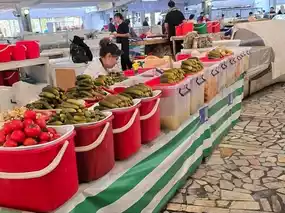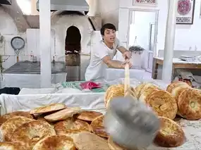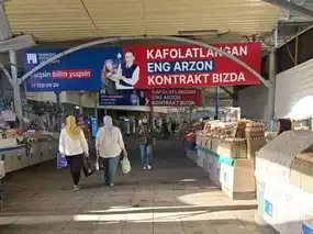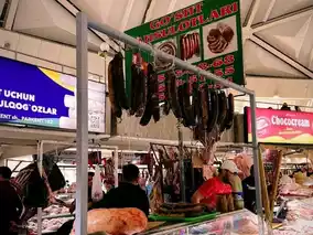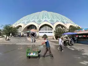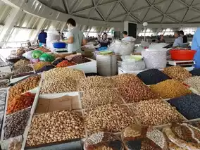 This is the Uzbek Central Market. Its exterior is a relic of the Soviet era, with a magnificent dome. Now used as a market, the vendors neatly display their produce. On the second floor, there's a nut stall. It's quite pleasant to browse, but I recommend checking prices before making any purchases. It's a great local market; if you have time, check it out. They sell local essentials at affordable prices.