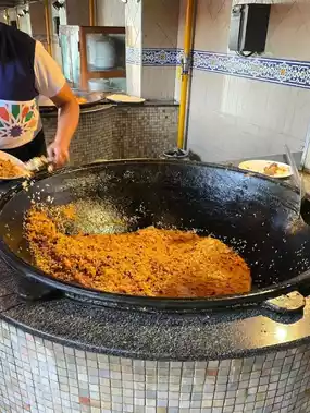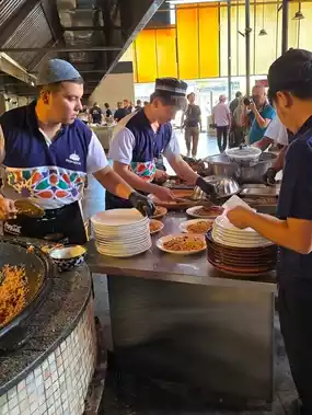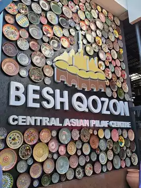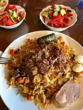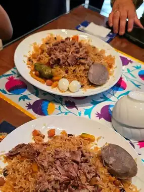 Besh Qozon, a magnificent multi-story restaurant, is renowned for its authentic Uzbek pilaf. On the ground floor, chefs stir giant pots of pilaf, drenched in grease and topped with tender chunks of meat. I ordered local bread, a plate of lamb pilaf, a few slices of horse sausage, and some dill salad to cut through the fat. The food arrived incredibly quickly, and the presentation lived up to its name. The pilaf was tender, and the carrots, rice, and raisins were fragrant—a truly delicious experience. A truly authentic Uzbek dining experience.