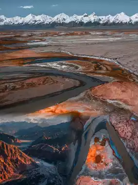 In the early morning, when the first rays of sunlight gently touch the snow-capped mountains, a golden glow instantly shines, as if draping the entire plateau in a mysterious and magnificent veil, like a dream.