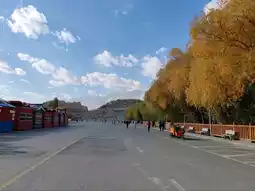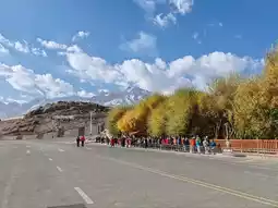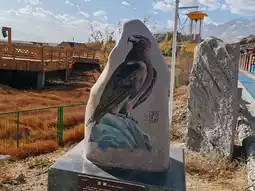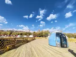 The Golden Grassland Square on the Pamir Plateau unfolds a magnificent picture under the autumn sun. The expansive golden wooden boardwalk stretches into the distance, complementing the snow-capped mountains, clear blue skies, and drifting white clouds. Unique transparent dome-shaped huts dot the landscape, adding a touch of modernity. Surrounding the area are vibrant small shops, the withered grasslands of the Aral Wetlands in the distance, and a stone monument depicting a golden eagle—all weaving a tale of the land’s rugged grandeur and delicate beauty.