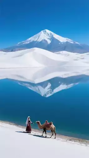 A sapphire blue plateau lake like glazed glass, backed by the “Father of Ice Mountains,” Muztagh Ata Peak. On a windless morning, the snow-capped mountain and white sand reflect symmetrically in the water, so beautiful it takes your breath away.