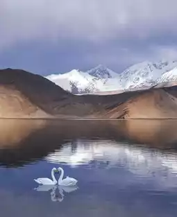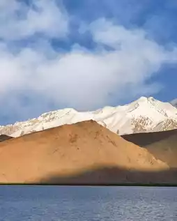 1️⃣ Karakul Lake shore: A stunning lake surface reflecting the golden mountain