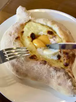 I ordered hachapuri, a traditional Georgian cheese bread.