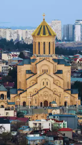 Start at the Holy Trinity Cathedral of Tbilisi, a monumental symbol of Georgian faith. This massive church stands tall on a hill, offering sweeping city views. Its interior is intricately decorated with paintings and natural light filtering through its stained-glass windows.