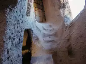 Inside is a network of tunnels and rooms. Kitchens, warehouses, wine cellars, dovecotes. Light filters through round openings, the air is cool, and footsteps echo loudly in the stone. It's as if the walls still remember the voices of those who lived here.