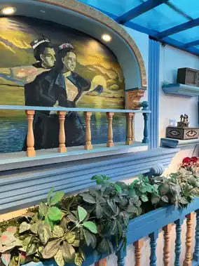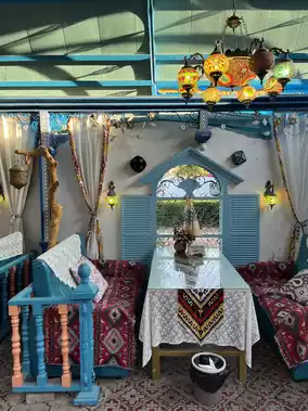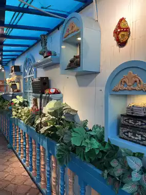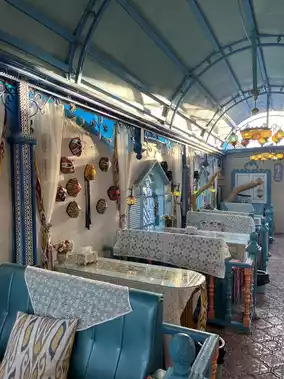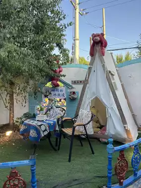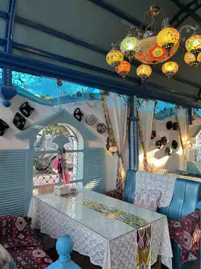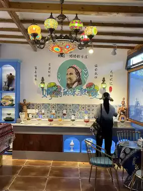 Unlike typical dessert shops, stepping inside reveals a high arched blue dome, colorful lighting, Uyghur-patterned tablecloths, and carved railings. The walls are adorned with handcrafted hats, woven fabrics, copper pots, and ethnic musical instruments, exuding a strong Central Asian vibe. Every detail feels like walking into a Uyghur home.