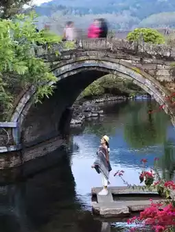 Small bridges, flowing water, birdsong, flowers, and clear lake water