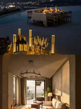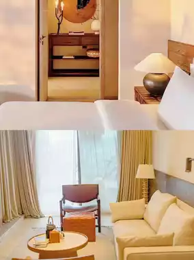 The hotel is located on the mid-mountain, with fresh air and a unique view of the evening glow and sunset. The pure white exterior of the hotel is very pleasing to the eye, and right below is the blue crescent-shaped infinity pool that looks amazing at night, with a strong Mediterranean holiday vibe that really feels like a vacation abroad!