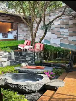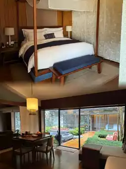 The room is spacious, with an area of more than 50 square meters, and the smallest courtyard is also 50 square meters, and all are equipped with independent pools. The pool is carved from a whole piece of granite, smooth and delicate, and the hot spring water is high-quality natural high-grade carbonated spring. You can enjoy private hot spring time in the room and relax your body and mind. The bedding is comfortable, and there will be a thoughtful good night sweet soup and night bed gift at night, which makes people feel warm.