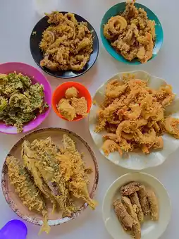 2. Celup Tepung – Fried seafood coated in crispy batter, served fresh and hot, is a crowd favorite. Imagine munching on prawns, squid, and fish by the beach—crispy goodness in every bite!