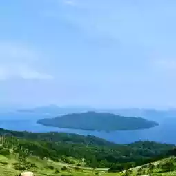 A caldera lake surrounded by mountains on all sides. The water from the lake is used as water for daily life in the surrounding area.