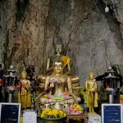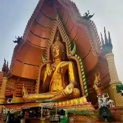 📌🌳☘️🛕🙏Wat Tham Suea, Tha Muang District, Kanchanaburi Province is one of the most famous temples in Kanchanaburi. The important thing that all tourists come here to worship is the largest Buddha statue in Kanchanaburi. The Buddha statue is beautiful, decorated with golden yellow mosaics that look radiant all over.