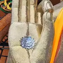 A giant golden Buddha with a cone shape can be seen in the blue sky
