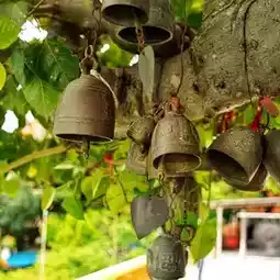 The breeze is blowing, and the wind chimes are swaying on the trees