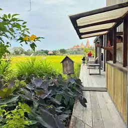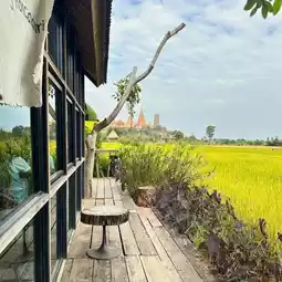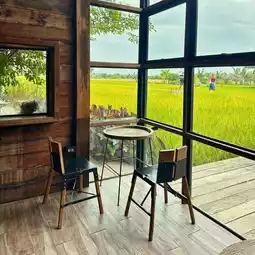 🥳 Mina Cafe is another popular cafe in Kanchanaburi that visitors should not miss. With a super chill atmosphere amidst lush green rice fields and a beautiful view of Wat Tham Suea, the cafe is decorated in a simple style with warm colors. There are many seating areas to choose from, both indoor and outdoor. It serves a variety of drinks and food at affordable prices with delicious flavors. There are also many beautiful photo spots to check in, whether it's a cool swing corner or a chilling corner by the rice fields. Let me tell you that for anyone looking for a place to relax near Bangkok, Mina Cafe is the best answer.