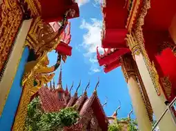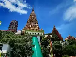 Wat Tham Suea in Kanchanaburi Province is a temple that stands out with a large golden Buddha statue, a 69-meter-high pagoda, and a beautiful chapel. It is located on a hill, offering beautiful views of the surrounding rice fields and mountains. There is also a small tiger cave inside the temple, and it is close to Wat Tham Khao Noi, a Chinese temple. Tourists can walk up the stairs or take the electric tram, and there are shops and restaurants. Dress appropriately, bring drinking water and a hat, and be careful when walking up the stairs.