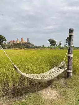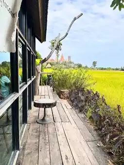 💯 The atmosphere at MEENA Cafe stands out with its stunning views of Tiger Cave Temple and lush rice fields, making it more than just a coffee shop. It's a truly relaxing and healing haven. The cafe emphasizes openness and comfort, with a variety of seating options, including the cool indoor area, the balcony, and bamboo pavilions jutting out into the rice fields, a popular spot for photo opportunities. It offers a truly natural feel.