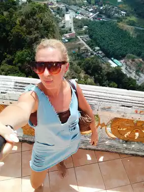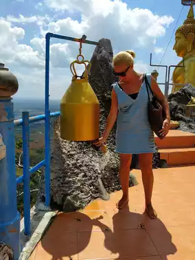 The main thing, of course, is climbing the stairs to the very top of the mountain, where there's a place of enlightenment, with a seated Buddha and a small pagoda (Khao Kaeo Ao Look Thano). The sign at the base of the mountain says there are 1,237 steps, but in reality, there are 1,260 😳, and I'll tell you why. Along the way, we came across a section where the old staircase had been replaced with a new one. The old steps were half a meter high, terrifying to look at, but the new ones were made with more humane steps, 10-15 centimeters high, and it was this replacement that changed the overall number of steps.