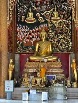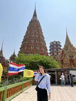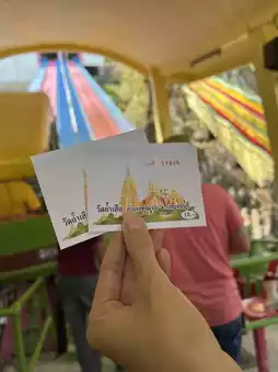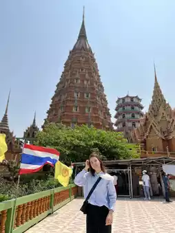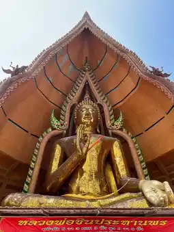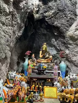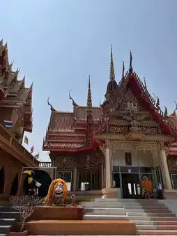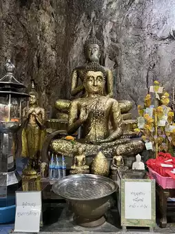 Tiger Cave Temple is a very beautiful temple with various architectures, whether it's the beautiful and exquisite paintings, especially the large Buddha statue located on the top of the mountain, standing out tall and glorious with a golden glow. It's very beautiful. This temple has two entrances, suitable for the general public, children, the elderly, and the disabled. There is a tram service and a long Naga staircase that goes up to the top of the mountain, suitable for testing your knees. It's very beautiful. On the way back, walk down the stairs on the left. There will be a small cave to worship the sacred objects. In addition, when you go up to worship the Buddha statue, you will also see a beautiful view, green rice fields, and a cafe atmosphere to sit and chill, lined up behind the temple. You can take pictures of the beautiful temple view. Don't forget to stop by...