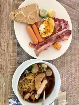 Breakfast is varied and delicious, but we didn't try the hotel's restaurant or cafe this time. Most of the guests are foreigners.