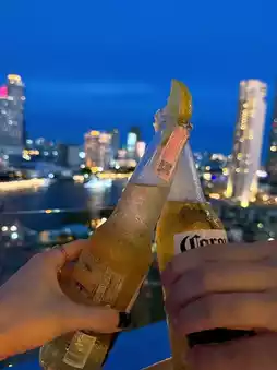 On the seventh floor of Iconsiam, you can enjoy a stunning view of the Chao Phraya River. The area is divided into three sections. If you make a purchase at Starbucks, you can access an outdoor area with a river view. The central section is a non-purchase area, but it's often crowded, making it difficult to find a spot by the railing for a solo photo. Recently, a small bar area has been added on the right side, offering a deal of buy three local beers and get one free. We ordered two Coronas, which cost around 650 baht including service charge and tax, and they also provided a small snack. It's worth it for the view and the chance to take photos without crowds. Enjoying a drink while feeling the river breeze and taking in the scenery makes for a pleasant evening. We recommend visiting at dusk when the sky turns a deep blue, as shown in the first photo.