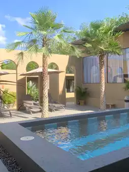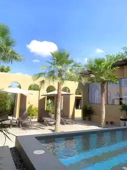 There is a swimming pool, an air-conditioned area with a view of the outside.