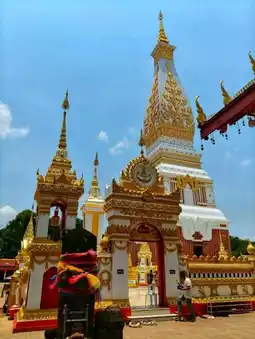 Enjoy the beauty of Phra That Phanom Borom Chedi, a sacred chedi for Thais. It houses the Buddha's breast relic, a sacred chedi for those born on Sunday. The chedi is a dazzling white and brass chedi, strikingly visible from afar, standing 57.5 meters tall.